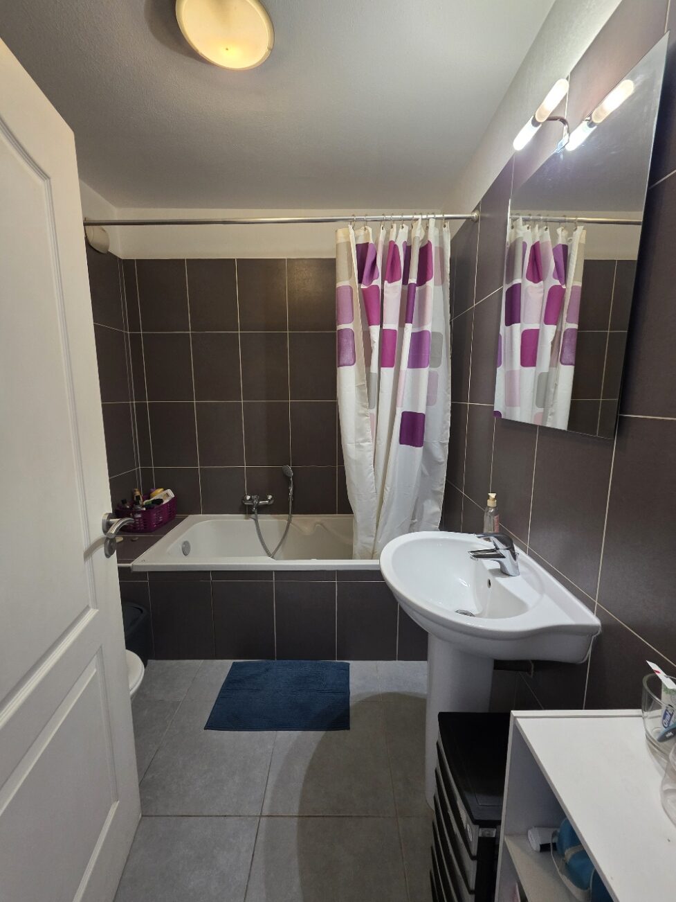 La salle de bains avec WC complète l’ensemble avec praticité, tandis que les grands rangements rappellent qu’un appartement bien conçu sait aussi se faire discret quand il s’agit d’organisation.